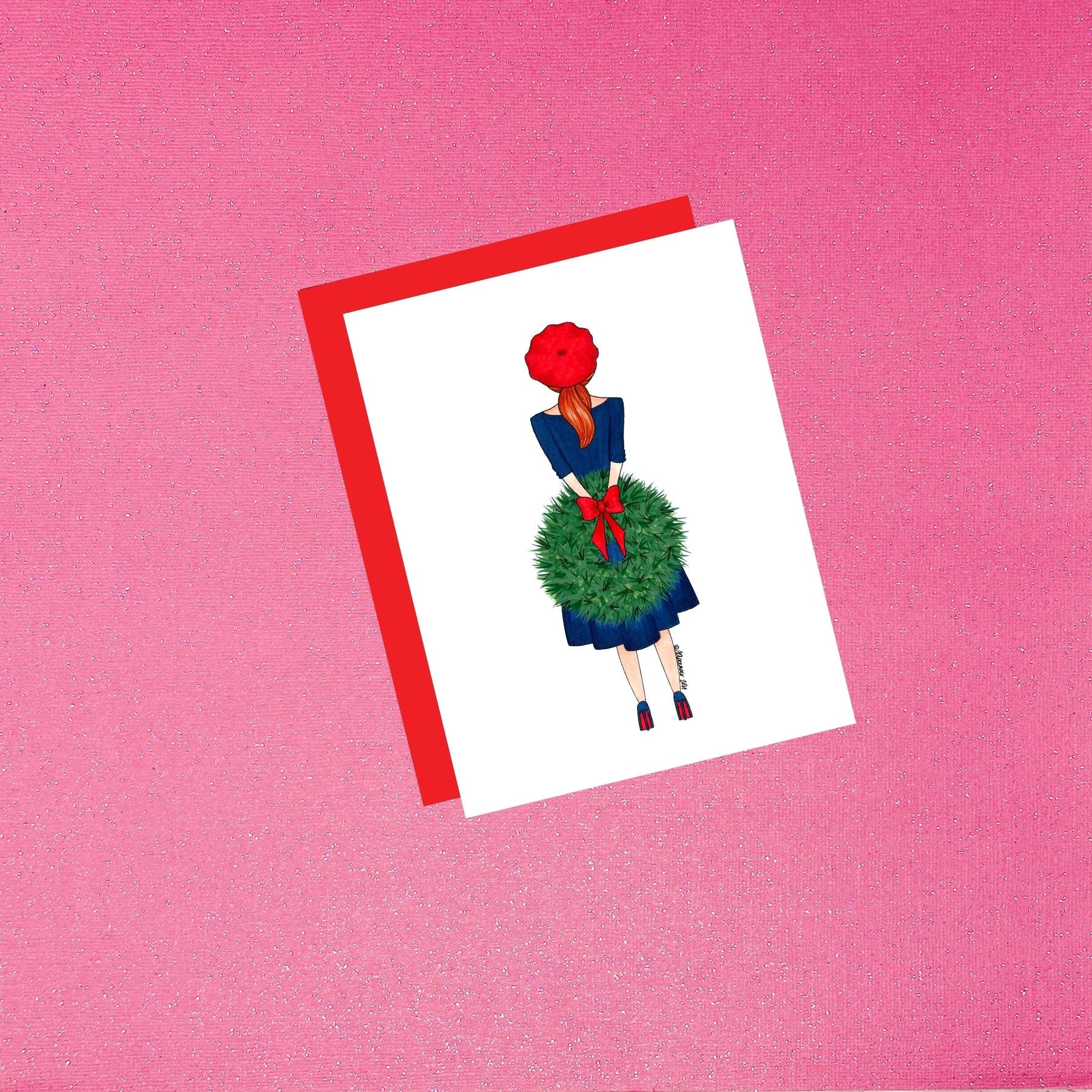 Step into a world of elegance with this 4.25x5.5 card, featuring a hand-drawn fashion illustration. A captivating fashion illustration showcases a woman with red hair and fair skin in an elegant blue dress, donning blue high heels and a red beret. Holding a large Christmas wreath behind her back, she exudes an air of mystery and style. The card's interior is blank, inviting your personalized touch. A coordinating envelope and protective cello packaging complete the polished presentation.